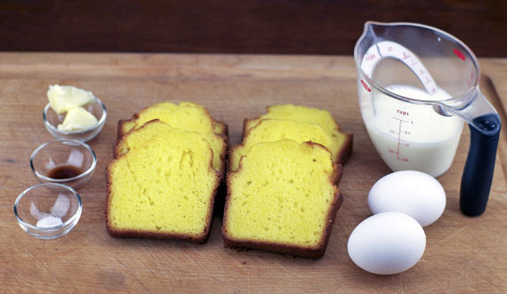 I went for a nice lemon bread that I found at the grocery store. My first inclination was to use a poppy seed loaf, but they didn’t have any. The custard mixture you soak the bread in is just a standard French toast custard made from eggs, milk, vanilla and a pinch of salt. (I skipped sugar because the bread was already very sweet.)