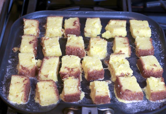 Next, melt a couple Tablespoons of butter in your frying pan or on your griddle and start frying nuggets. I used medium heat for these. I’d normally go with medium-high for French toast, but you want to give yourself more time and flexibility because you have a lot of flipping to do. Once the nuggets are golden brown on both sides (2 or 3 minutes per side), you’re ready to go.