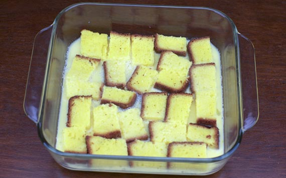 First, you cut the bread into bite-size pieces and then beat together your custard ingredients. I transferred the bread to a baking dish and covered the pieces with custard – flipping them once so they absorbed the maximum amount of goodness. (You can dip the pieces in the bowl that you mix the custard in, but that gets messy and time-consuming.)