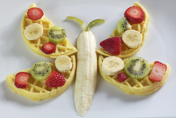 Here’s a fun project to brighten your morning. Kids of any age will love helping to make their own personal waffle butterfly. If you use frozen waffles, the whole thing takes about 3 minutes. Best of all, your kids will be having such a good time decorating, they won’t realize that they’re inadvertently getting a serving of fruit.