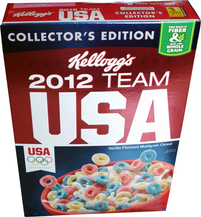 Kellogg's website gave this description of the cereal: "Celebrate the 2012 Olympics with this vanilla-flavored multigrain cereal - a fun combination of red, white, and blue loops. This Collector's Edition carton has athlete trading cards on the back! Get it quick, only available for a limited time."