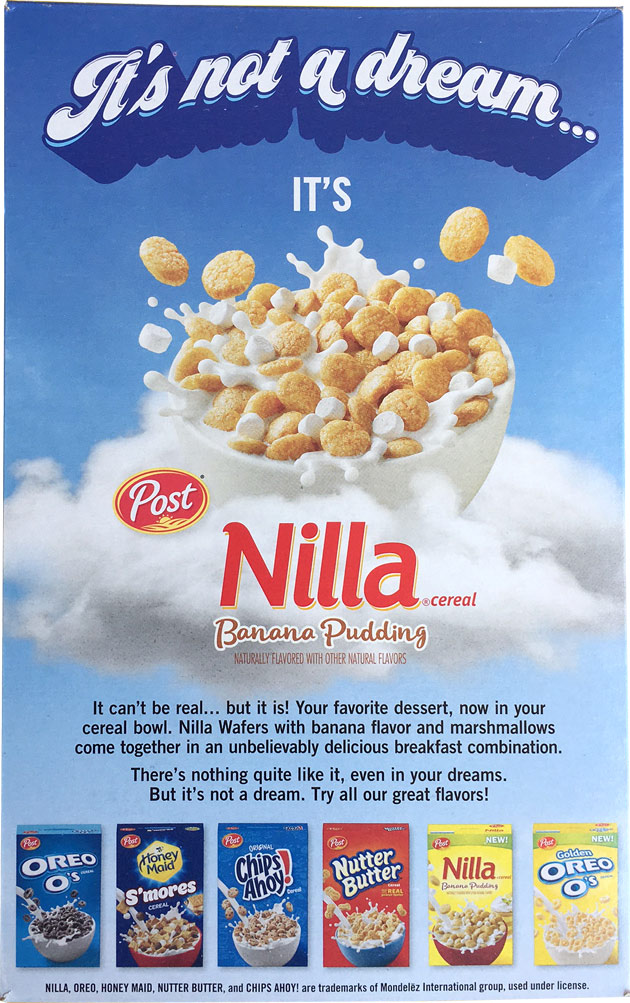 "It's not a dream... It's Post Nilla Banana Pudding Cereal. It can't be real... but it is! Your favorite dessert, now in your cereal bowl. Nilla Wafers with banana flavor and marshmallows come together in an unbelievably delicious breakfast combination. There's nothing quite like it, even in your dreams. But it's not a dream."