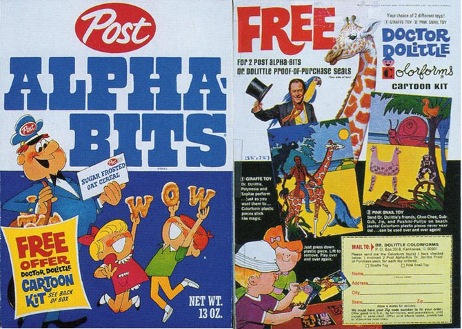 A box of Post Alpha-Bits cereal with an offer for a Doctor Dolittle Colorforms Cartoon Kit.