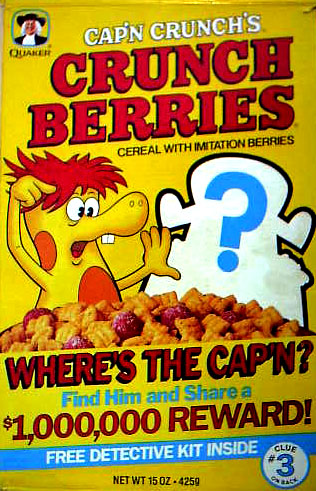 From Quaker, a box of Cap'n Crunch's Crunch Berries Cereal with Imitation Berries. "Where's The Cap'n? Find him and share a $1,000,000 reward! Detective kit inside."
