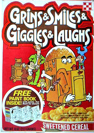 From Ralston, a box of Grins & Smiles & Giggles & Laughs Cereal with a free paint book inside.