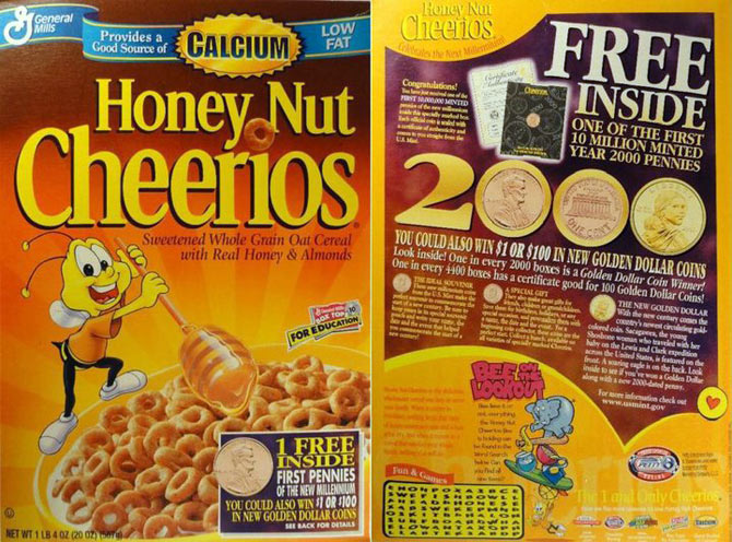 From General Mills, a box of Honey Nut Cheerios: "Free Inside! One of the first 10 million minted year 2000 pennies... you could also win 1 dollar or 100 dollars in new golden dollar coins."