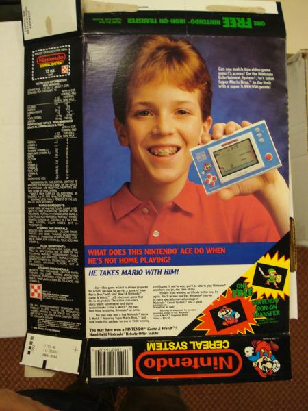 Back of a box of Nintendo Cereal System Cereal with promo for mini Mario Bros. game: "What does this Nintendo ace do when he's not playing? He takes Mario with him!"