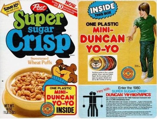 From Post, a box of Super Sugar Crisp cereal with one plastic mini-Duncan yo-yo free inside and information to enter the 1980 Super Sugar Crisp Duncan Yo-Yolympics.