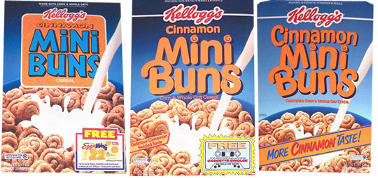 Three different boxes of Kellogg's Cinnamon Mini Buns - all from the early 1990's.