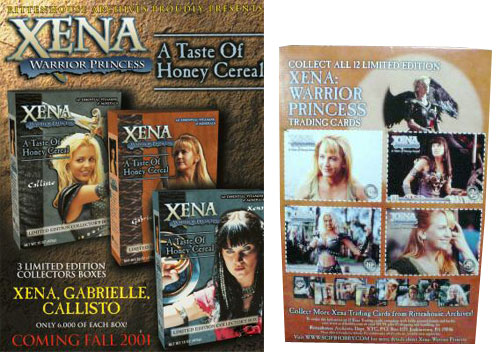 The sell sheet from 2001 for Xena: A Taste Of Honey Cereal and an example of the cut-out cards from the back of the box.