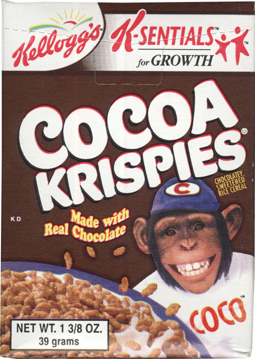 This sample box of Kellogg's Cocoa Krispies featured a real monkey as the recurring mascot Coco the Monkey who's usually illustrated. Pretty fun.