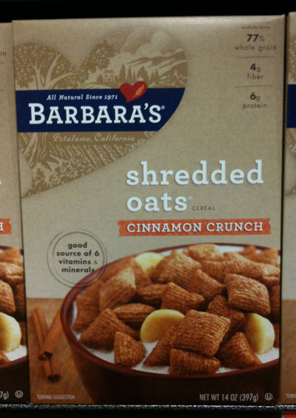 The front of a box of Cinnamon Crunch Shredded Oats from Barbara's Bakery as the cereal appeared in stores January of 2011.