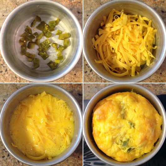 Spread jalapenos evenly on bottom of pan. Sprinkle cheese evenly over them. Pour beaten eggs over the cheese.